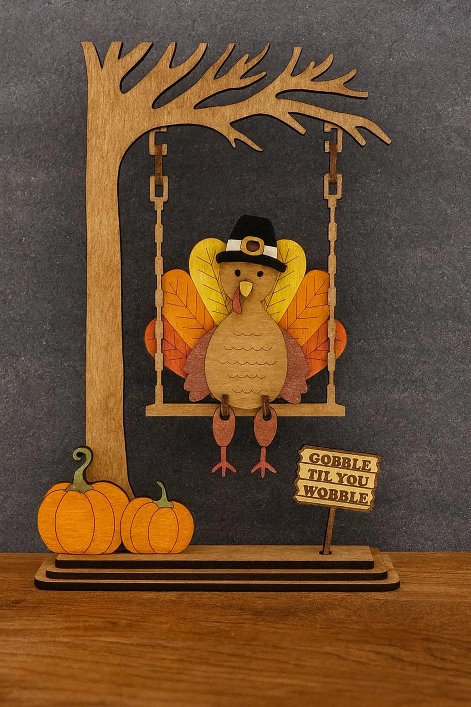 Our Swingin' Thanksgiving Turkey brings autumn's warmth to your space! Measuring 13×20cm (approx. 5"×8") 📏,This laser-cut maple wood decor features a cheerful turkey wearing a pilgrim hat 🎩, surrounded by colorful fall leaves and pumpkins, with the playful phrase "Gobble 'Til You Wobble" – perfect for adding holiday spirit to any room!