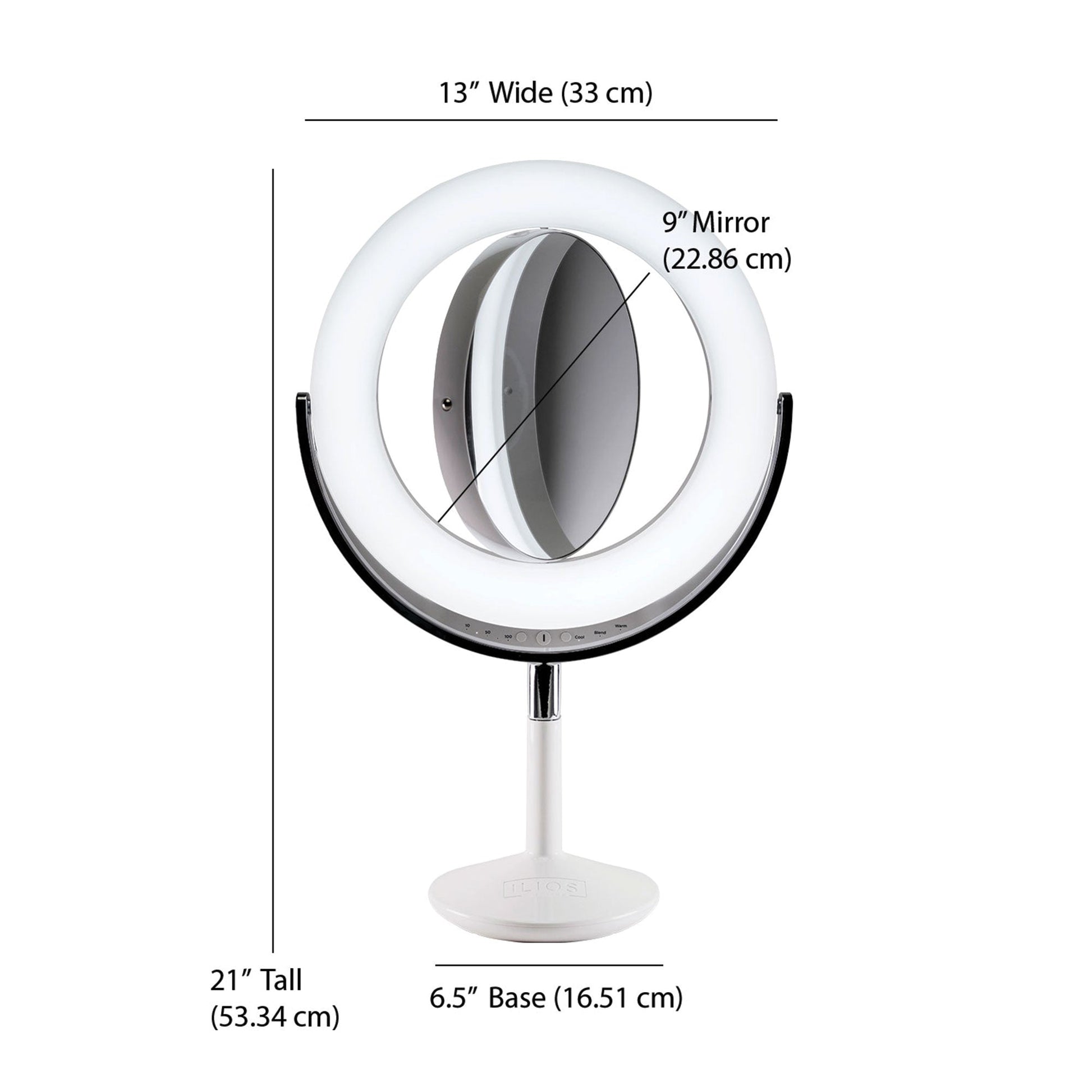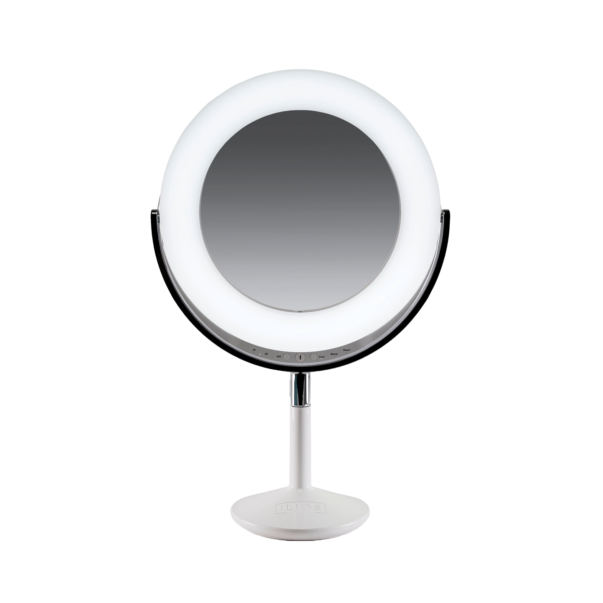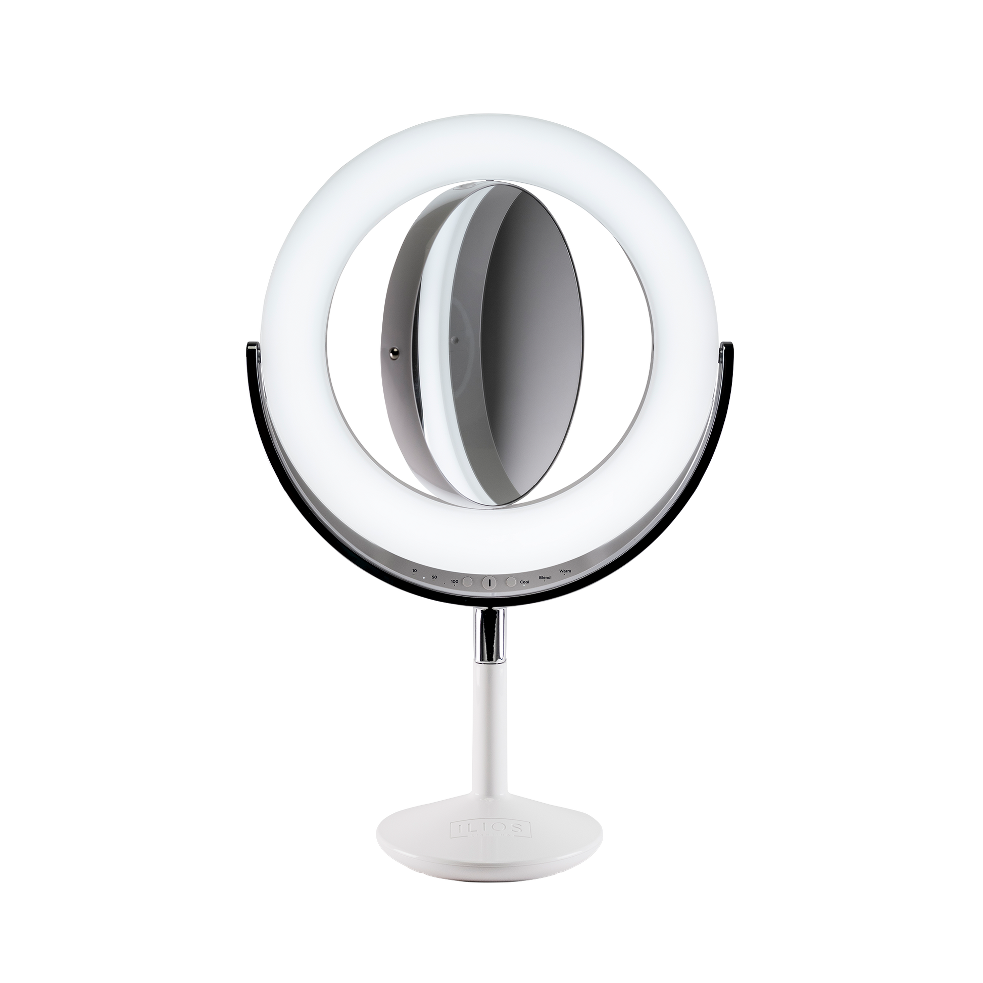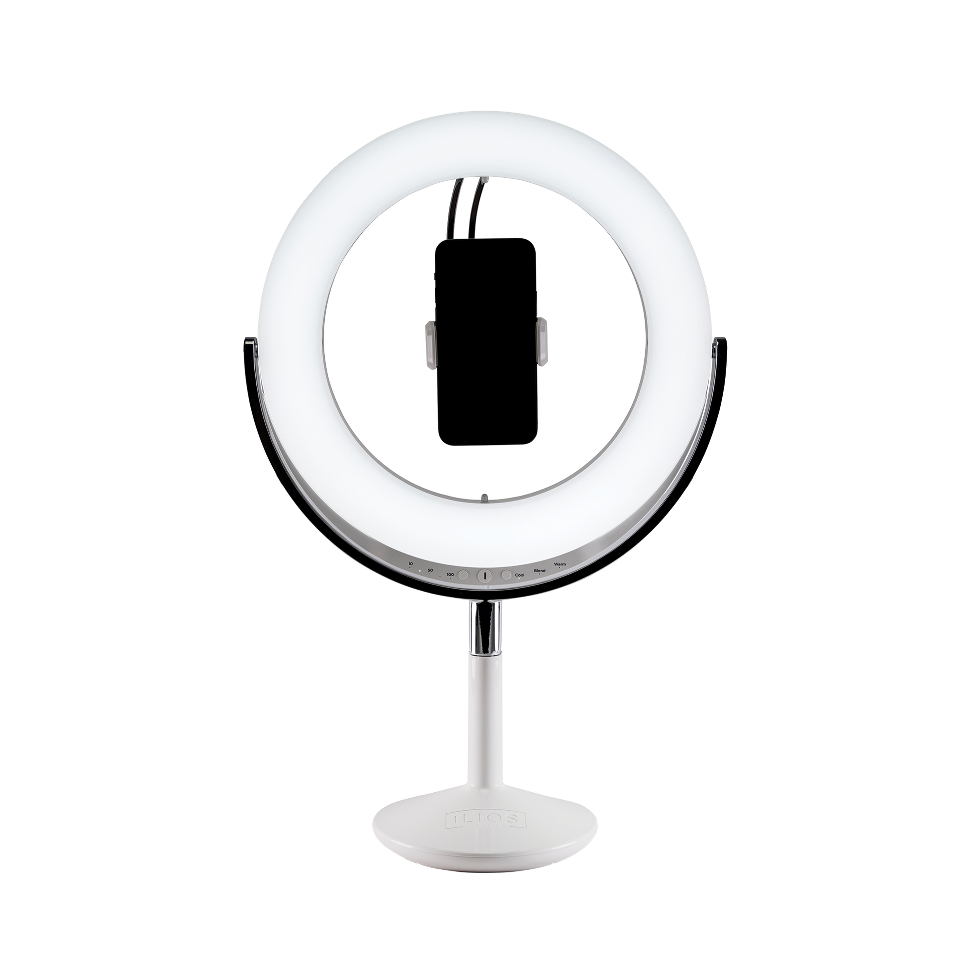BACKORDERED UNTIL MID SEPT. The Beauty Ring makeup mirror replicates natural daylight for flawless application. Adjust brightness and color temperature easily. With reversible sides offering 1x and 5x magnification, it's perfect for detailed work. Plus, built-in mounts for your phone and webcam enhance content creation and video calls.