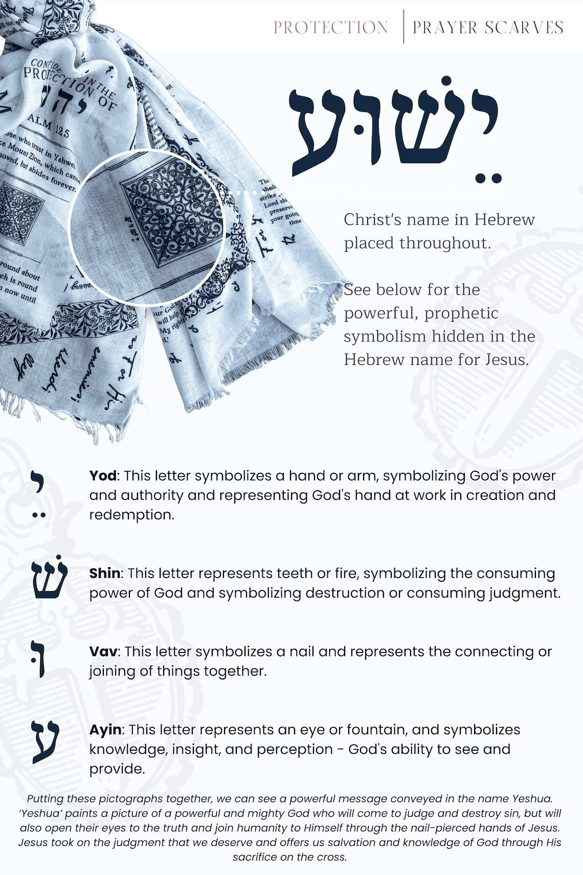 Adorned with scripture, this scarf is a declaration of God's constant love and care, with Jesus's name, "Yeshua," in Hebrew, affirming His role as our protector throughout. Featuring seven favorite scriptures, including Psalm 23 and Psalm 91, it offers spiritual comfort and protection to those who seek solace in God's word.